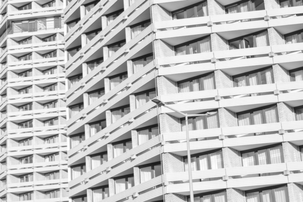Obiekt: Manhattan Zespół mieszkalno-usługowy przy Placu Grunwaldzkim. Architekt: Jadwiga Grabowska-Hawrylak. 1967-1970. Brutalizm